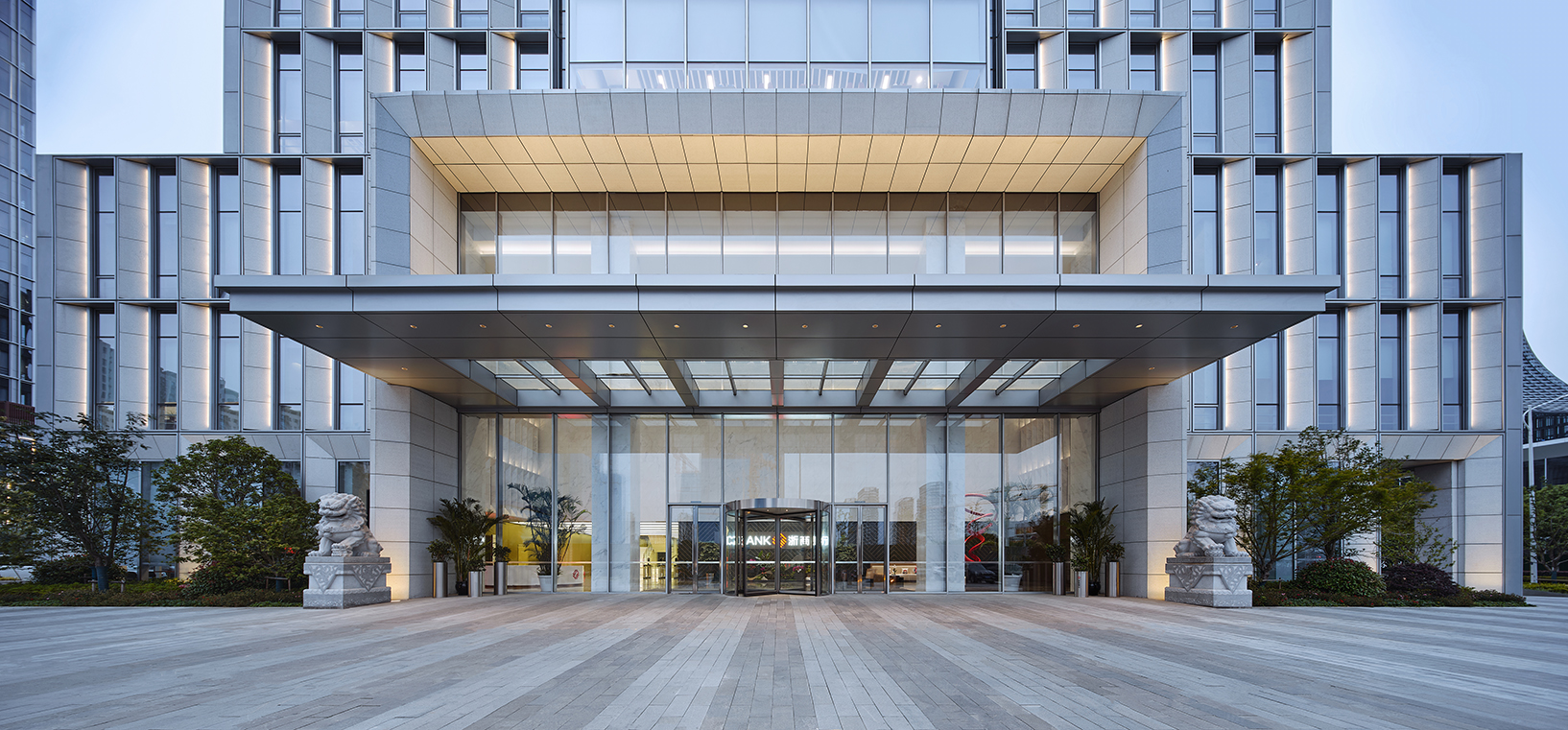 項(xiàng)目位于蘇州工業(yè)園區(qū)旺墩路沿線,總體布局以城市界面和肌理作為切入點(diǎn),建筑東 立面塔樓居于裙房中央布置,形成儀式感和標(biāo)志性較強(qiáng)的對(duì)稱界面,以建筑語(yǔ)匯突出 浙商銀行的企業(yè)形象。