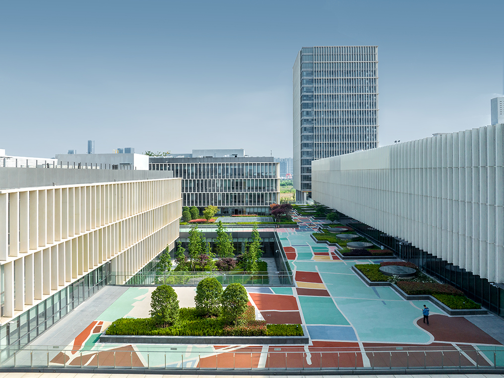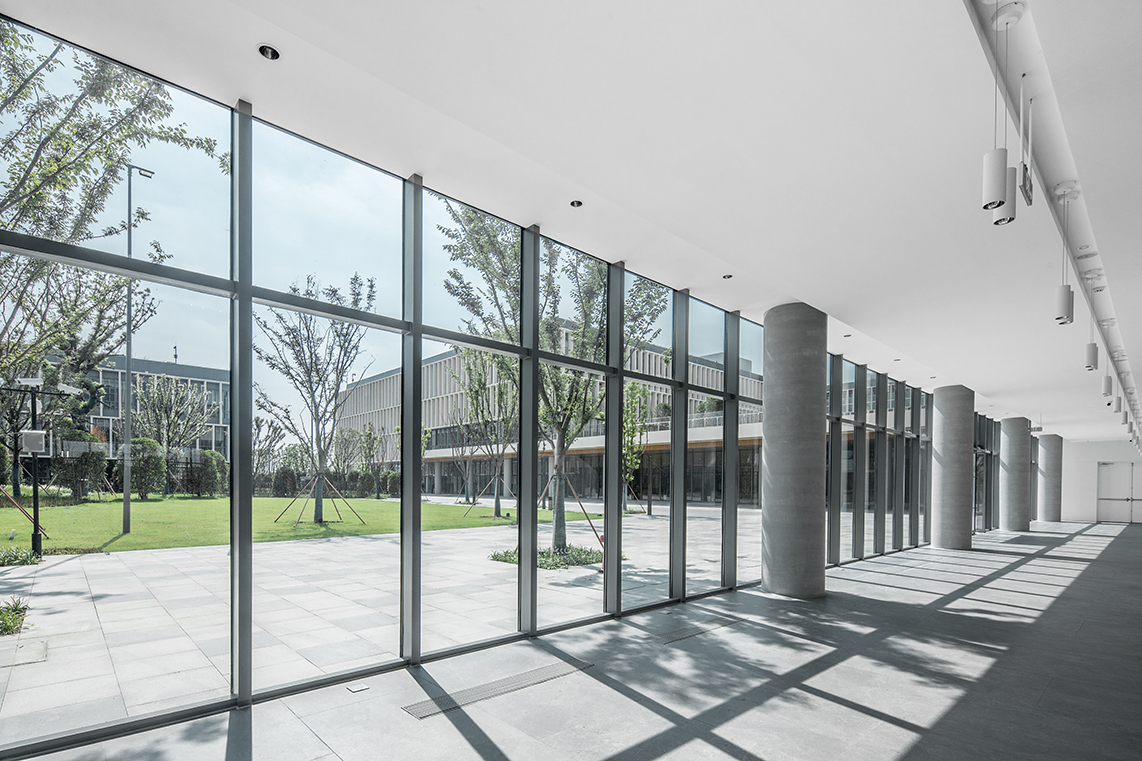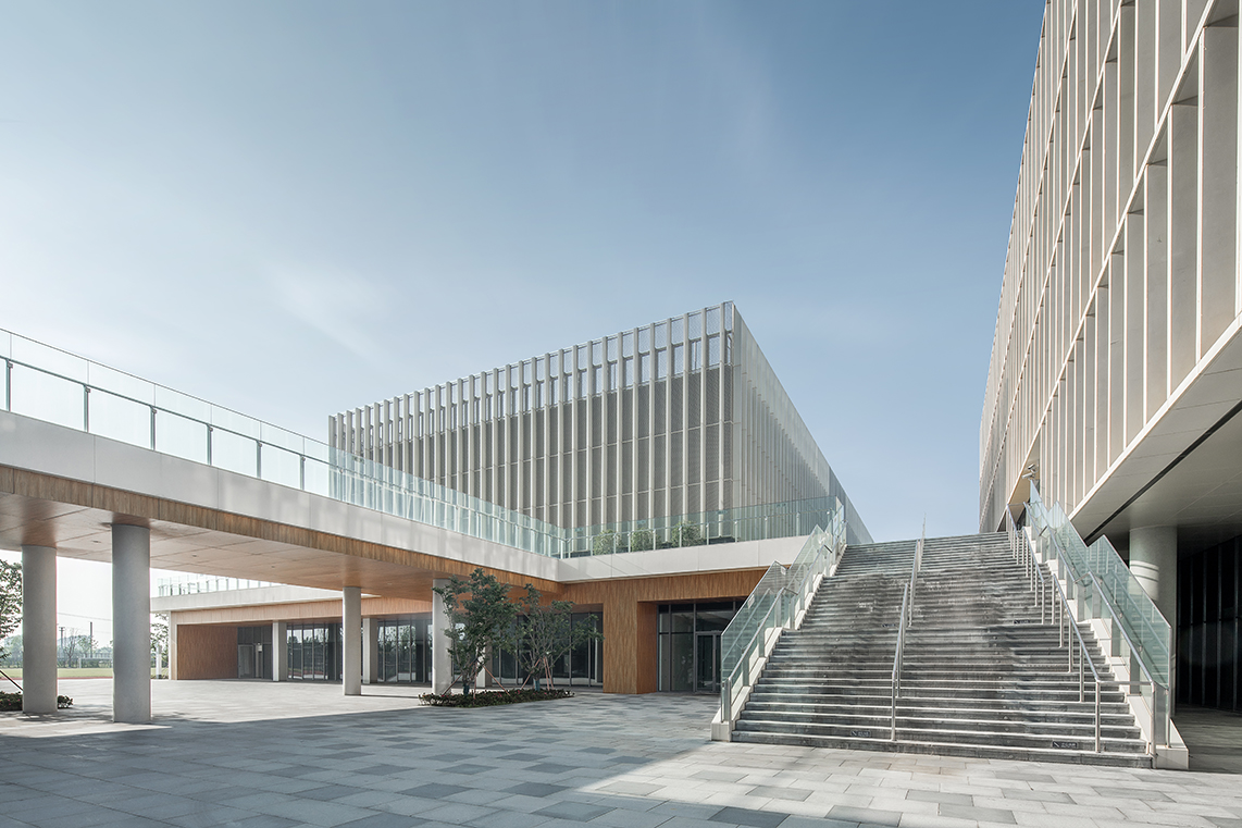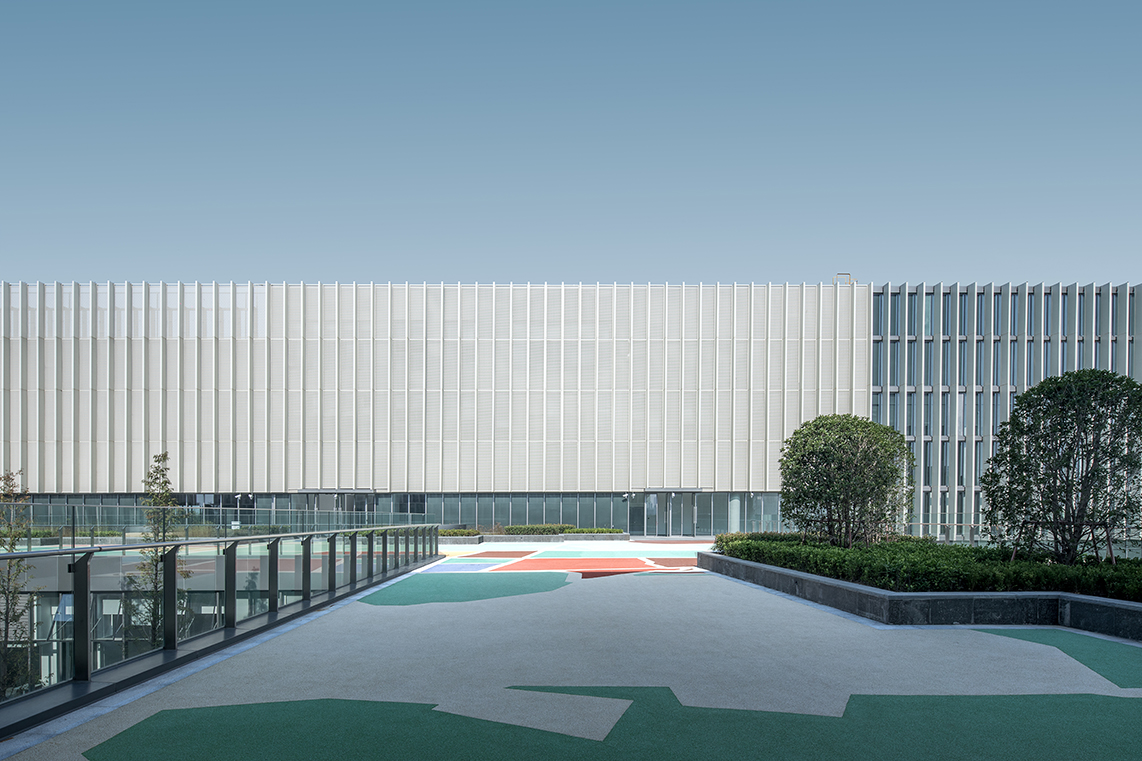 項目位于蘇州市相城區(qū),主要教學(xué)樓分為幼兒園、小學(xué)及初高中三棟樓,建筑體量方正,又由南向北逐級抬高,宛如錯落有序的三個“燈籠”,寓意薈同國際的教學(xué)理念——“點亮求知”。建筑單體多以幕墻及落地玻璃圍合,立面通透,輔以UHPC板造型圍合,呼應(yīng)了符合當?shù)厝宋臍庀⒌奶K式花格窗以及編織造型的燈籠形象。教學(xué)單元與文化體育中心、公寓通過開敞柱廊的串聯(lián),方便了校內(nèi)步行交通的便利性,在空間形式上也對應(yīng)了蘇式園林中廊道的建筑語匯。