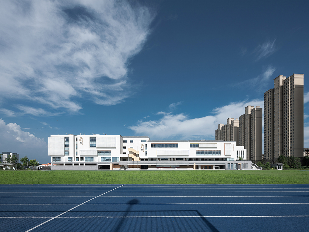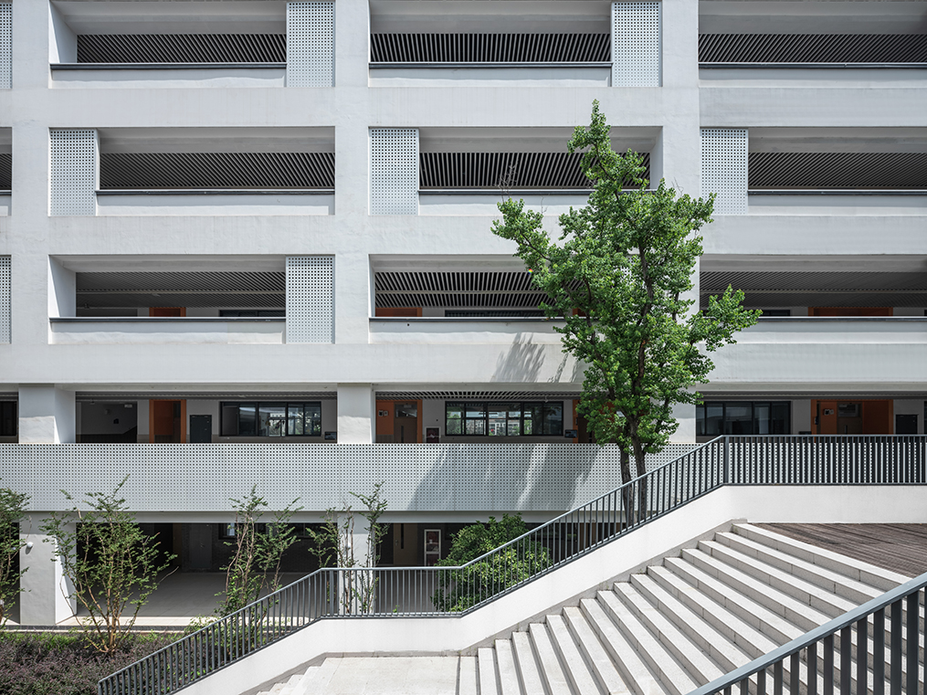 傳統(tǒng)的條形教室以走廊串聯(lián)的模式限制了校園空間格局形式并不適用于本方案,在日照的限制下,以功能環(huán)串聯(lián)交融為構(gòu)成手段的布局,不僅將集約高效率的教學(xué)模式演繹透徹,還創(chuàng)造出多樣的廣場(chǎng)、庭院空間。