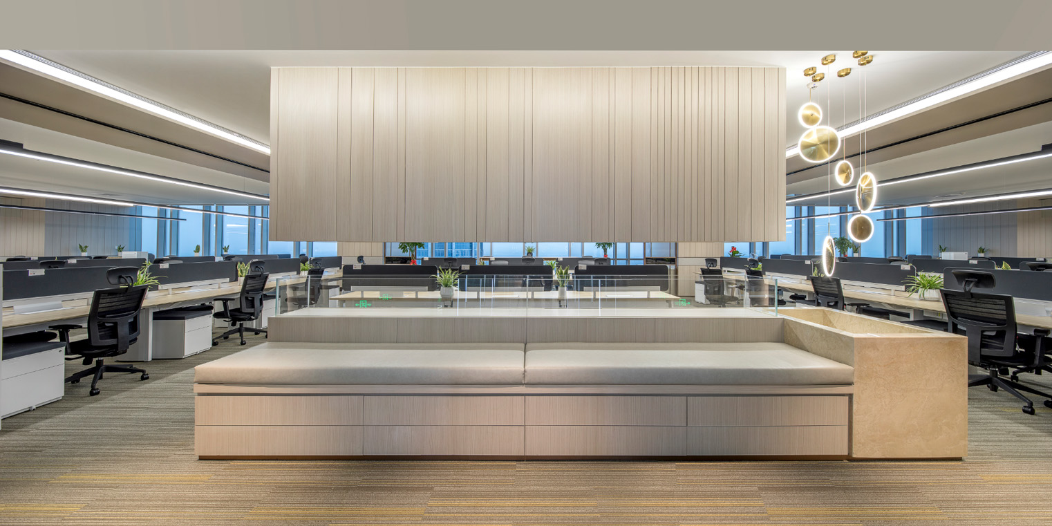 上海金融期貨信息技術(shù)有限公司蘇州分公司項(xiàng)目位于月亮灣區(qū)域制高點(diǎn)中新大廈38層。當(dāng)離地垂直高度超過(guò)162m,設(shè)計(jì)師希望這個(gè)空間擁有足夠的寬度,用來(lái)裝下每個(gè)人的情緒。