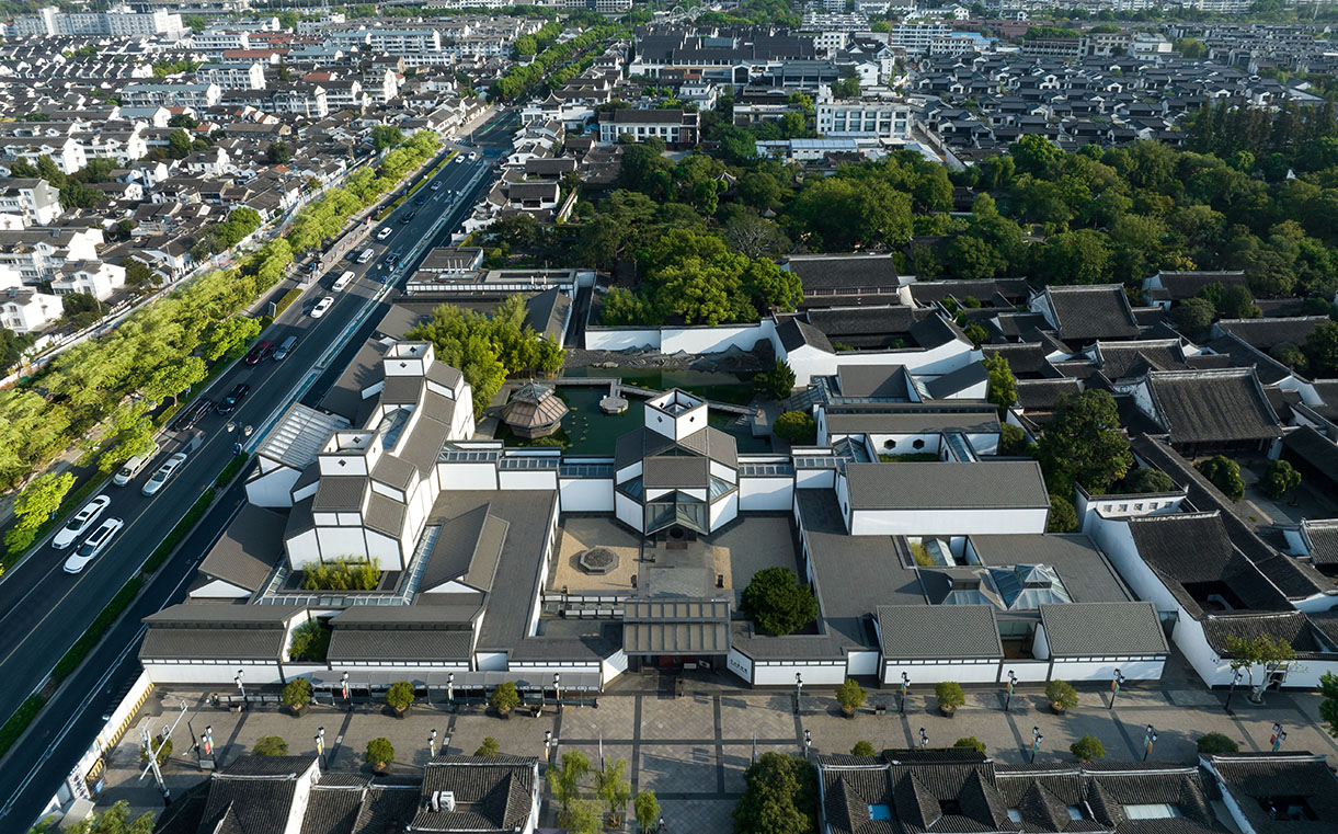 在整體布局上,項(xiàng)目巧妙借助水面,與緊鄰的拙政園、忠王府相連,成為原有建筑風(fēng)格的延伸。建筑群坐北朝南,分成三大塊:中部為入口、中央大廳和主庭院;西部為博物館主展區(qū);東部為次展區(qū)和行政辦公區(qū)。博物館包括 7500 ㎡展品陳列室、一個(gè) 150 座禮堂、辦公區(qū)、文物保護(hù)工作室、研究圖書(shū)館及庫(kù)房。