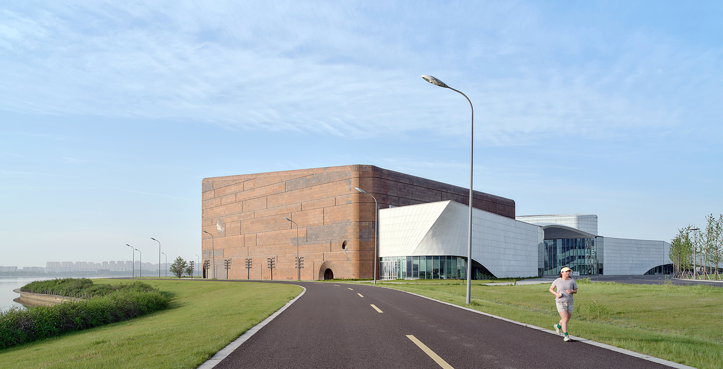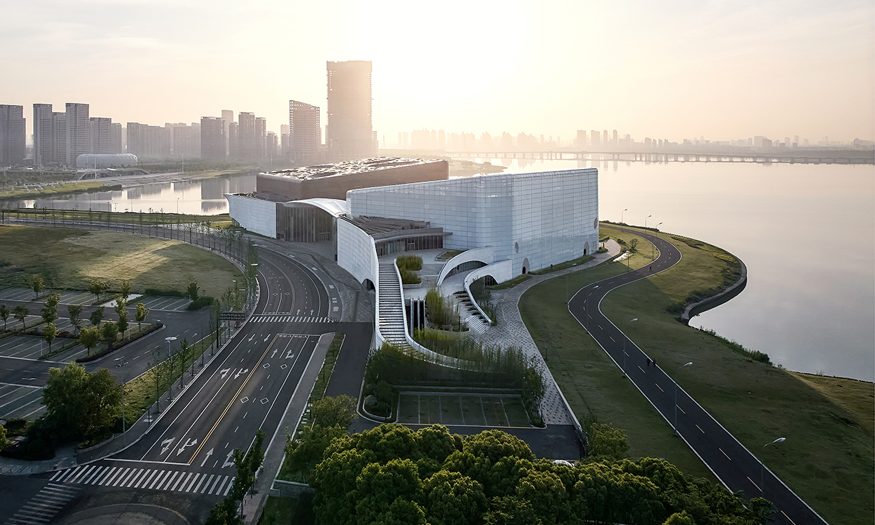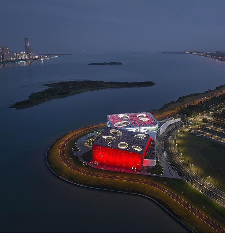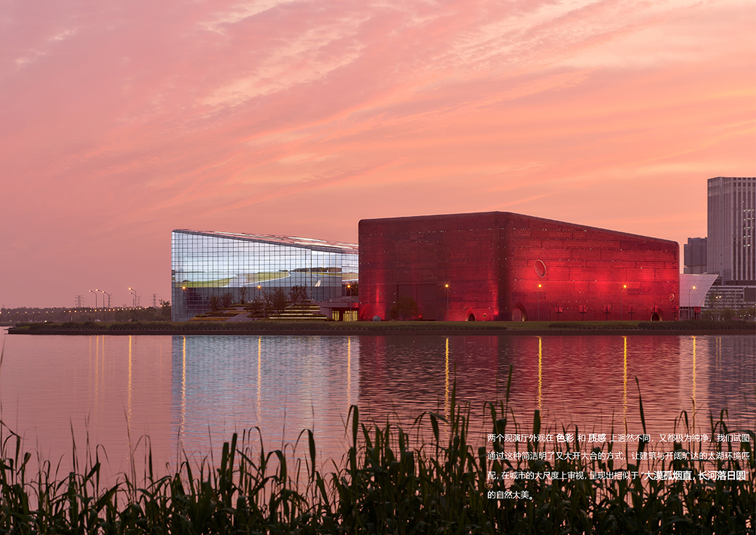 橙天嘉禾360劇場(chǎng)項(xiàng)目地處吳中太湖新城核心區(qū),項(xiàng)目建成后成為太湖周邊重要的文化標(biāo)志性建筑。設(shè)計(jì)采用“湖畔礫石”的理念,坐落在湖邊的建筑宛如自然環(huán)境中生長出來的石頭,坡地景觀的柔美自由和兩塊礫石的硬朗干脆形成鮮明對(duì)比,突顯了本項(xiàng)目與太湖文化及生態(tài)環(huán)境協(xié)調(diào)一致的理念。