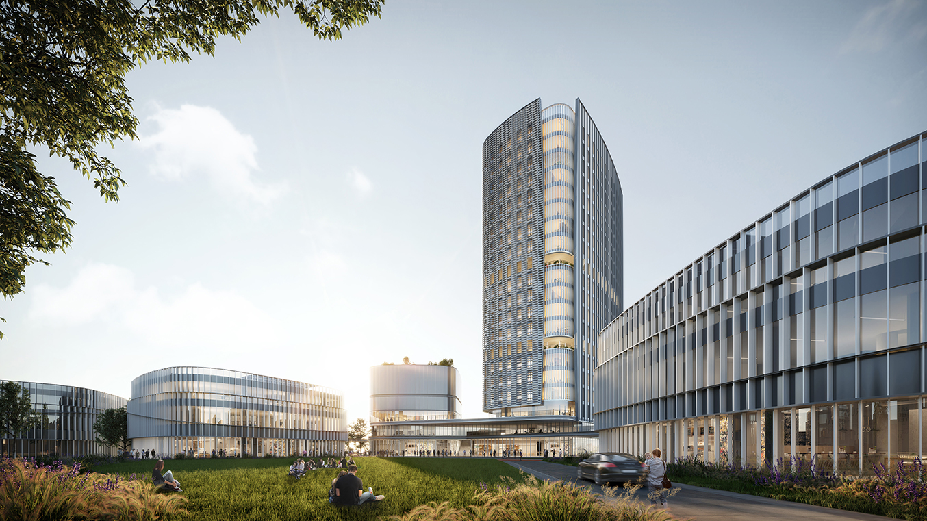 項(xiàng)目以打造“一個(gè)連接的商務(wù)社區(qū)+豐富的生態(tài)系統(tǒng)+一個(gè)生態(tài)豐富的商務(wù)社區(qū)”的低碳科技園為愿景,融合獨(dú)特性、連接性、開放性、可持續(xù)性、智慧性、靈活性;通過研究機(jī)器智能學(xué)習(xí)運(yùn)算,分子結(jié)構(gòu)與電路結(jié)構(gòu),樞紐與鏈接形成本項(xiàng)目的設(shè)計(jì)方法。由塔樓與其裙房作為核心,將模塊化的建筑組團(tuán)作為最基本的元素進(jìn)行設(shè)計(jì),形成具有動感的城市界面及天際線形象,與昆承湖有機(jī)互動,成為高新區(qū)新地標(biāo)。